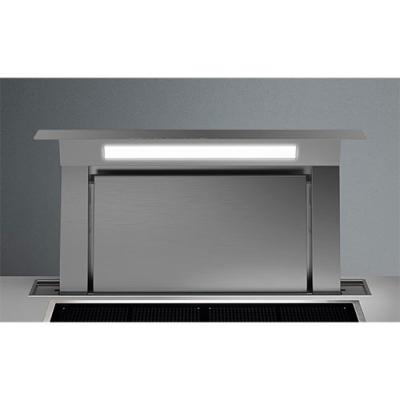 Dank eines motorisierten Systems hebt sich die Dunstabzugshaube während des Betriebs aus dem hinteren Teil der Arbeitsplatte und saugt Dunst und Dämpfe auf Topfhöhe an.