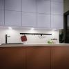 Die LUMICA® Unterbauleuchte Pure Farbwechsel LED ermöglicht es jederzeit, eine passende Lichtstimmung im Bereich der Arbeitsplatte zu schaffen. Das flache Gehäuse der Leuchte im Design von Studio Moritz Putzier ist aus einem Kunststoff in einem transluzenten matten Weiß gefertigt. Dank der modernen Optik fügt sie sich harmonisch im Unterbodenbereich von Hängeschränken ein und die Ausleuchtung ohne sichtbare LED-Punkte schafft ein ruhiges Ambiente. Die Leuchte ist kompatibel mit dem LUMICA® LIC LED-System von Naber und enthält eine Lichtquelle der Energieeffizienzklasse G. Die Regulierung der Lichtfarbe erfolgt stufenlos von Warmweiß bei 2700 Kelvin bis hin zu Kaltweiß mit 6500 Kelvin. Die zuletzt gewählte Einstellung wird über eine Memory-Funktion gespeichert. Parallel dazu lässt sich die Helligkeit ebenfalls stufenlos mit der Dimmfunktion einstellen. Die maximale Helligkeit liegt bei 80 Lumen/ Watt im Bereich der kaltweißen Lichtfarbe. Eine in der Unterbodenleuchte integrierte Steckbuchse erlaubt die Reihenschaltung mehrerer Leuchten. Die im Lieferumfang enthaltene Zuleitung für das Ministecksystem hat eine Länge von 1800 mm. Für die Steuerung werden ein Funktionskonverter sowie eine Fernbedienung aus dem LUMICA® LIC-System benötigt. Alternativ erfolgt die kabellose Steuerung über das Smartphone oder ein Tablet mithilfe der zugehörigen App.
