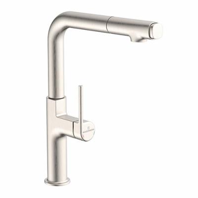 mit schwenk-/herausziehbarem (Strahl/Brause per Druck am Auslaufende umstellbar), seitlichem Hebel, Keramikkatusche.