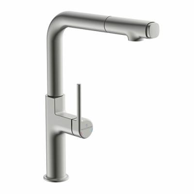 mit schwenk-/herausziehbarem (Strahl/Brause per Druck am Auslaufende umstellbar), seitlichem Hebel, Keramikkatusche.