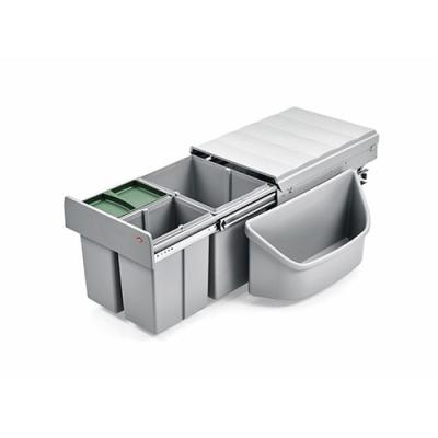 Mithilfe des Abfallsystems Traditionline Trio-Master Corner 360 S/400-3 lässt sich der in Diagonal-Eckschränken mit Drehtüren verfügbare Platz effizient nutzen. Es zeichnet sich durch eine komfortable Bedienung und viele weitere nutzerfreundliche Features aus. So stellt der Abfallsammler einen großen Behälter mit einem Fassungsvermögen von 16 Litern zur Verfügung sowie zwei 8-Liter-Eimer. Einer der kleineren Behälter lässt sich dank des inbegriffenen Bio-Deckels separat verschließen, womit die Küche von unangenehmen Gerüchen durch Bio-Abfälle bewahrt wird. Vollständig abgedeckt wird das Müllsystem allerdings durch den Gehäusedeckel, der zugleich als Ablage genutzt werden kann. Darüber hinaus bietet es zwei seitlich angeordnete Putzmittelbehälter. Sie lassen sich dank integrierter Vollauszüge vorziehen und bei Bedarf abnehmen. Die Mülltrennung selbst verfügt über einen Handauszug über die Frontblende und bietet einen leichtgängigen Vollauszug. Das gesamte System kann ohne großen Aufwand auf dem Schrankboden montiert werden und lässt sich zu jeder Seite um 22° drehen.