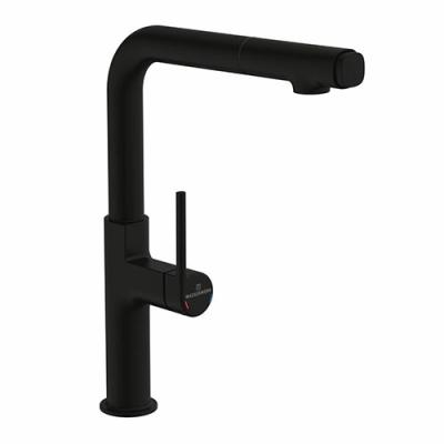 mit schwenk-/herausziehbarem (Strahl/Brause per Druck am Auslaufende umstellbar), seitlichem Hebel, Keramikkatusche.