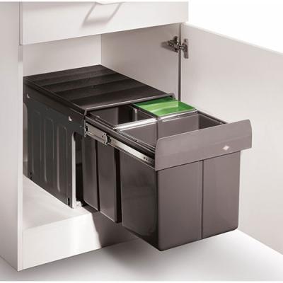 Für Küchenunterschränke mit einer Drehtür konzipiert, ist das Mülltrennsystem Trio ein praktischer Helfer bei der Entsorgung des anfallenden Haushaltsmülls. Das Abfallvolumen beträgt insgesamt 32 Liter, wobei ein Mülleimer mit 16 Liter sowie zwei weitere mit jeweils 8 Litern zur Verfügung stehen. Im Lieferumfang ist ein spezieller Biodeckel enthalten, der aufgrund seiner speziellen Bauweise keine Gerüche nach außen in die Küche dringen lässt. Beim Schließen des Mülltrennungssystems legt sich zusätzlich ein Gesamtdeckel über alle Behälter. Als ebenso praktisch erweist sich der Vollauszug, da er einen bequemen Zugriff auf alle Eimer ermöglicht. Das tragende Gestell ist für eine unkomplizierte Bodenmontage im Schrank ausgelegt.