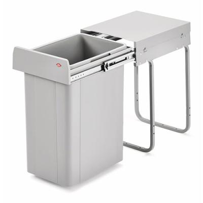 Das Mülltrennsystem ist in einer durchdachten Auszugstechnik speziell für Drehtüren konzipiert. Dem Eigenbedarf entsprechend kann das Modell mit einem Abfallvolumen von 26 Litern erworben werden. Der Einzelbehälter ist an den Rändern mit Griffmulden ausgestattet, die das Herausheben zur Entsorgung des Mülls erleichtern. Zur Grundausstattung gehört ein Gesamtdeckel, der auf dem Gestell befestigt wird und sich zum Reinigen mühelos abnehmen lässt. Der Vollauszug mit robusten Führungsschienen ist dank der Griffleiste im Frontbereich einhändig bedienbar. Die Montage des Mülltrennungssystems erfolgt unkompliziert auf dem Schrankboden.