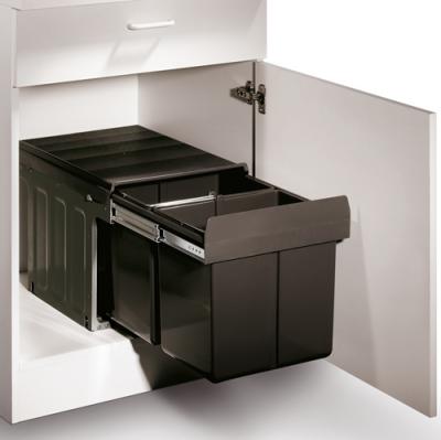 Mit einer geringen Einbauhöhe von 345 mm lässt sich das Mülltrennsystem Double Master platzsparend in Drehtür-Küchenschränken einsetzen. Seine Maße erlauben ebenso eine Integration im Spülenschrank, da sich hier ein Abstand zu den Wasseranschlüssen und dem Siphon einrichten lässt. Der Einbau-Abfallsammler mit einem Gesamtvolumen von 32 Litern umfasst zwei Behälter mit jeweils 16 Litern Füllvolumen. Es ist also genügend Platz vorhanden, um diverse Haushaltsabfälle gezielt zu sortieren. Der Gesamtdeckel schützt die Küche vor unangenehmen Gerüchen und kann als alternative Ablagefläche für beispielsweise Putzmittel genutzt werden. Zur komfortbietenden Ausstattung gehört auch der Vollauszug mit silberfarbener Führung. Die einfache und unkomplizierte Montage des Mülltrennungssystems erfolgt auf dem Schrankboden.