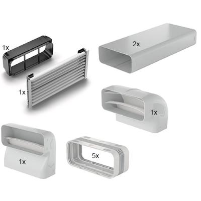 Das Compair® Sockel-Lüftungsgitter-Set Prime flow 150 dient der komfortablen Ableitung von Küchendünsten. Es eignet sich gleichermaßen für Downdraft- oder Muldenlüftungssysteme. Das Set ist Bestandteil des innovativen Compair® Prime flow-Abluftsystems, das durch seine strömungstechnisch verbesserten und optimierten Luftleitkörpern punktet. Geeignet ist das Abluftzubehör zum Anschluss von Flachkanälen. Die eckige Außenabdeckung besteht aus einem Sockel-Lüftungsgitter mit Lamellen, das in unterschiedlichen Farbausführungen zur Auswahl steht. Weiterhin zeichnet sich das Set durch das integrierte N-Klick-System aus. Es sorgt für eine sichere Verbindung mit dem patentierten Universalverbinder. Dieser stellt eine Zwei-Lippendichtung mit Rasterelementen zur Verfügung. Strom- und Datenkabel können über die praktische Kabelführung verlegt werden. Das Verbindungsset besteht aus zwei P-VRO-Flachkanalrohren der Stärke 150 mm, je einem P-RBV 150 Rohrbogen vertikal 90° in langer und kurzer Ausführung, dem Sockel-Lüftungsgitter flow sowie fünf flachen P-UVB 150 Universalverbindern. Dank der werkzeugfreien Steckverbindung wird eine ebenso komfortable wie sichere Montage ermöglicht.